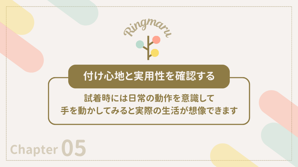 また、試着時に手を握る、指を伸ばすなどの日常動作を意識して動かしてみたり、朝と夕で2回試着して、むくみを考慮したサイズ感をチェックすることが大切です。